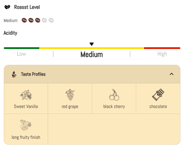 • Sweet Vanilla, Red Grape, Black Cherry, Chocolate, Long Fruity